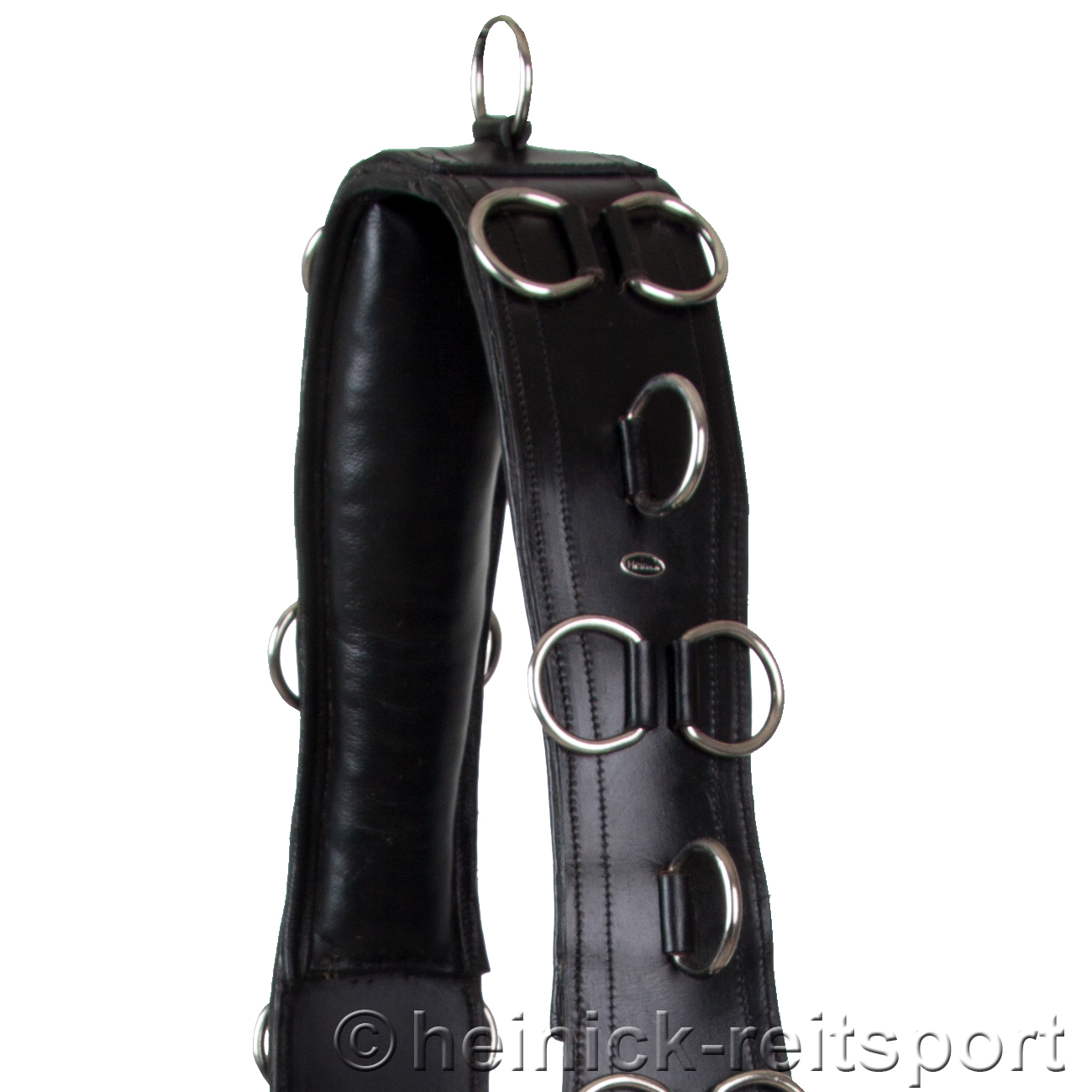 Der anatomisch geformte Longiergurt garantiert durch die besondere Form eine optimale Ellenbogenfreiheit und mehr Bewegungsraum für Ihr Pferd. Der Gurt hat 20 Ringe und ermöglicht einen professionellen Einsatz beim Longieren, auch mit Doppellonge und Hilfszügeln. Zusätzlich verfügt dieser Longiergurt über wollegefüllte Kissen um den sog. Nussknackerefekt zu verhindern. Dieser Heinick Longiergurt ist beidseitig verschnallbar und hat einen weich gepolsterten Bauchgurt. Wir bieten diesen hochwertigen Lederlongiergurt in den Farben Braun, Schwarz und Schwarz-Tan, sowie der Einheitsgröße für Vollblut (=Cob) und Warmblut (= Full) an.